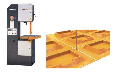 The single or multiple vacuum forming sheet is placed on the conveyor belt of the machine. As the vacuum forming advances through the machine the waste material is trimmed from the remaining part by a horizontal band saw blade. Leaves quite a reasonable edge, but may require scraping.