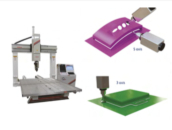 The vacuum forming is placed on a vacuum jig on the bed of the machine as the router head machines all the apertures, slots and removes the waste material. Leaves a very clean accurate edge that often does not require additional cleaning. 3 axis for trimming on the X, Y, Z axis. 5 axis for additional trimming of slots and holes from all directions A + B.
