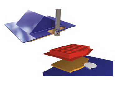 This provides a clean accurate cut but usually a small flange is unavoidable. The vacuum forming, custom made steel rule cutting die and a polypropylene cutting board are fed through the roller press between the top and bottom rollers separating the waste material from the part. Leaves a very clean accurate edge that does not require additional cleaning.